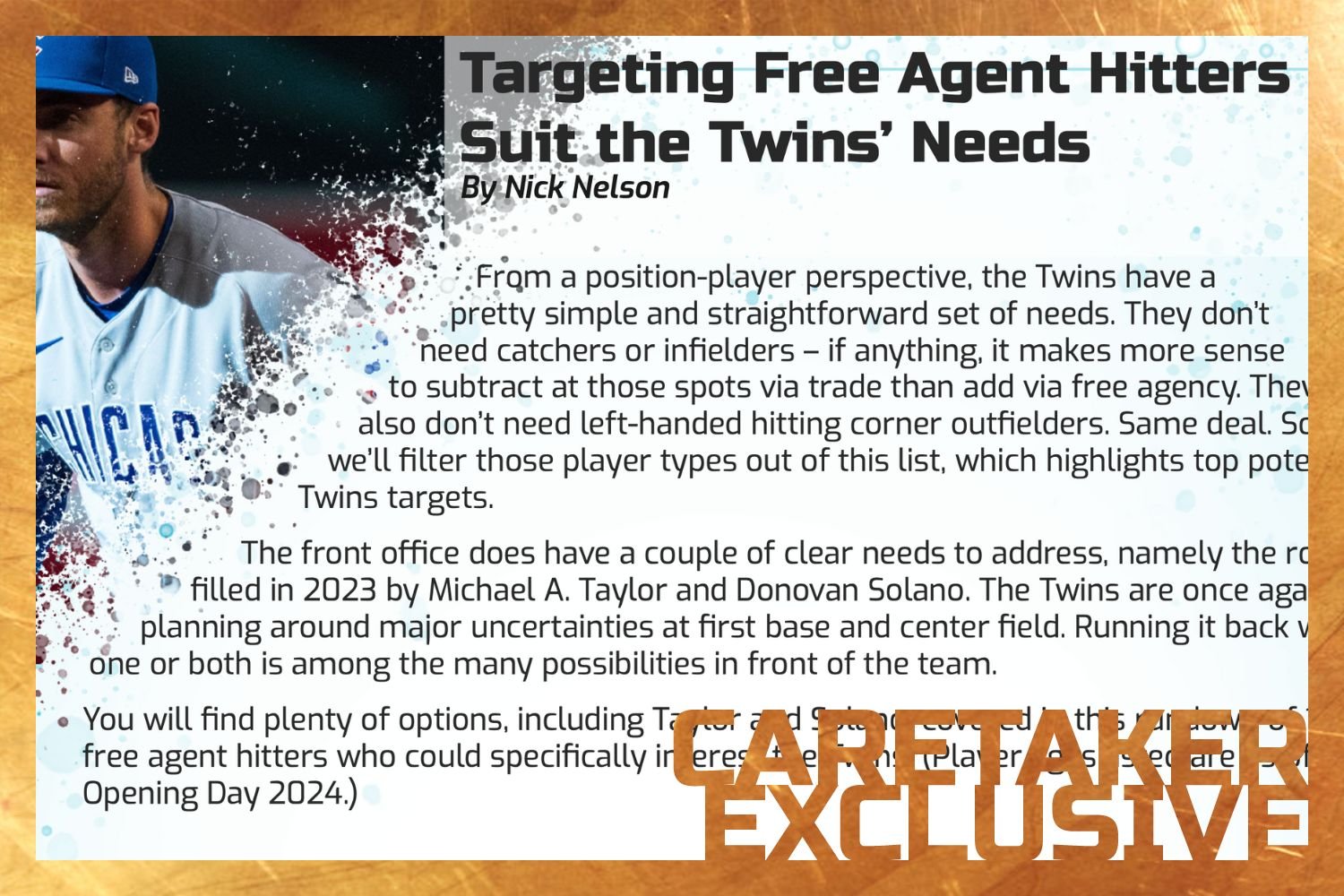 You will find plenty of options covered in our Offseason Handbook rundown of 15 free agent hitters who could specifically interest the Twins. Read on to find a few of those names or – if you're a Caretaker – all of them! (Player ages listed are as of Opening Day 2024.)