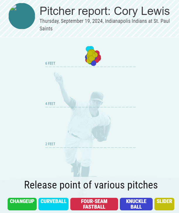 Lewis threw 86 pitches including 26 sliders, 26 four-seam fastballs, 15 changeups, 10 curveballs, and nine knuckleballs. He had just four Whiffs, all on his slider.