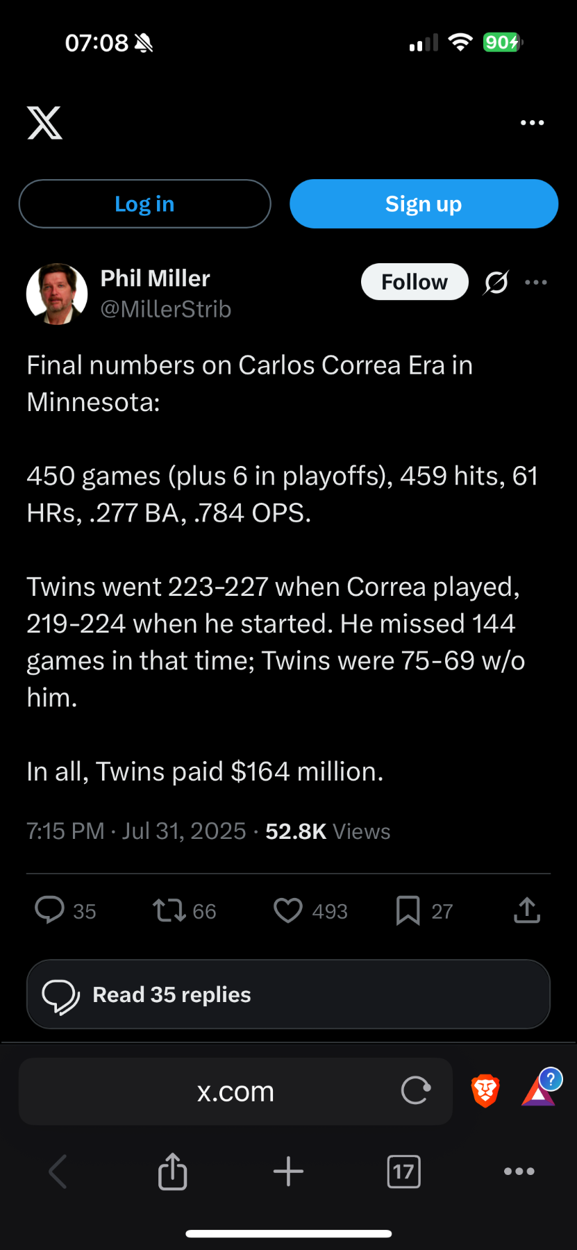 "The Twins are a 4th place team. Paying Carlos Correa a bunch of money to play for a 4th place team has no value. The Twins were going to pay him $44M before they had a chance to be relevant again in 2027 (a completely sunk cost) and who knows if Correa will still be playable in 2027. The Astros were basically the only team who wanted him and they overpaid despite having leverage. It's actually amazing the Twins pulled this one off."