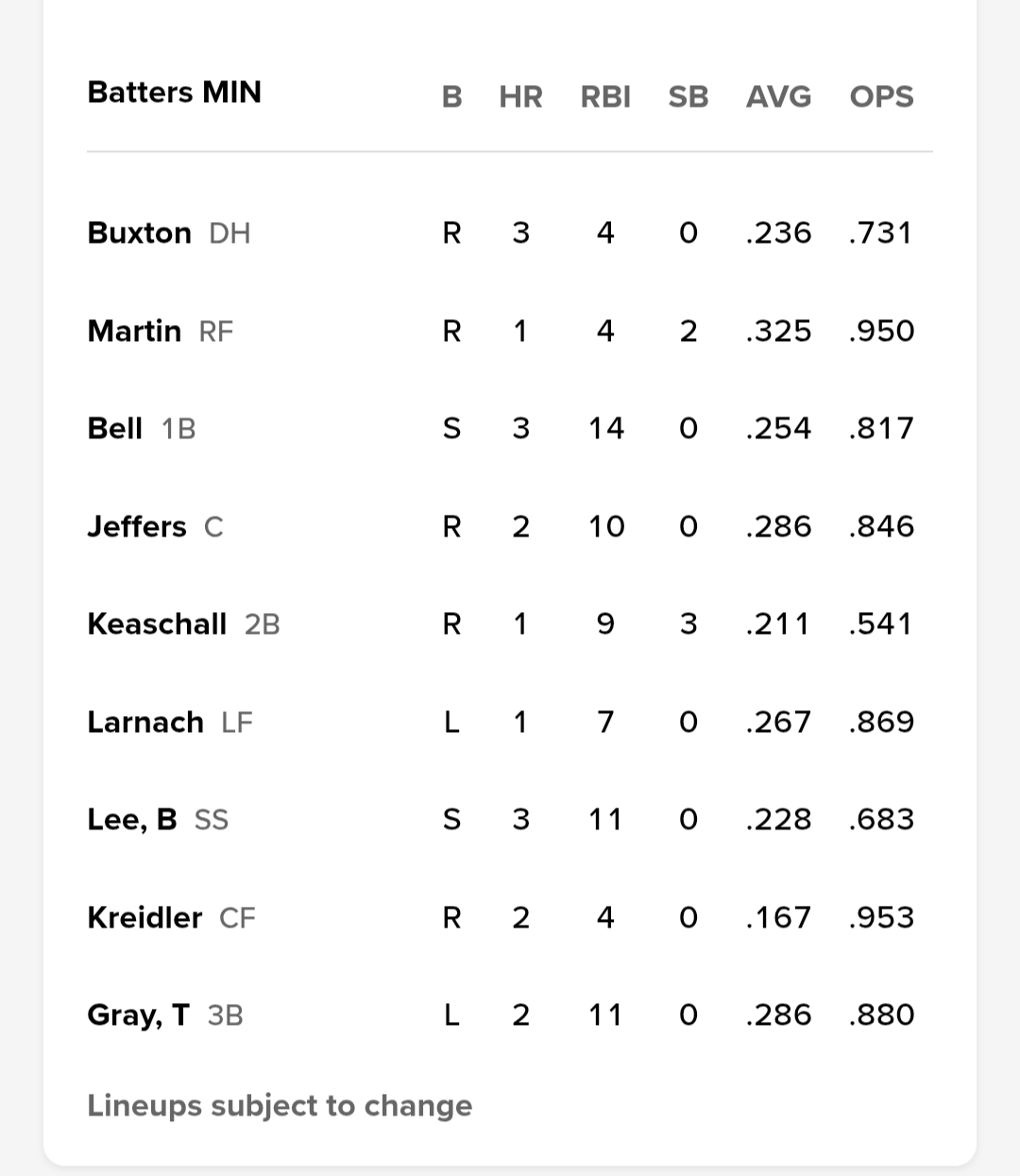 Not surprised the lineup isn't cut and paste, especially a day game after a night game. Keaschall has had a couple of tough days in the last two games, so it figures that he moves down in the order. Kreidler and Gray hitting 8-9 against a lefty won't strike fear for Tito.