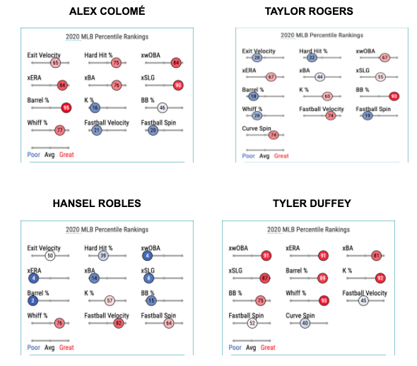 Parker Hageman provided really good insight on Colomé here and here. Although written back in August, Matthew Trueblood did an excellent job of dissecting Taylor Rogers issues in 2020 here. Cooper Carlson and JD Cameron wrote quick hitters in Robles here and here, respectively.