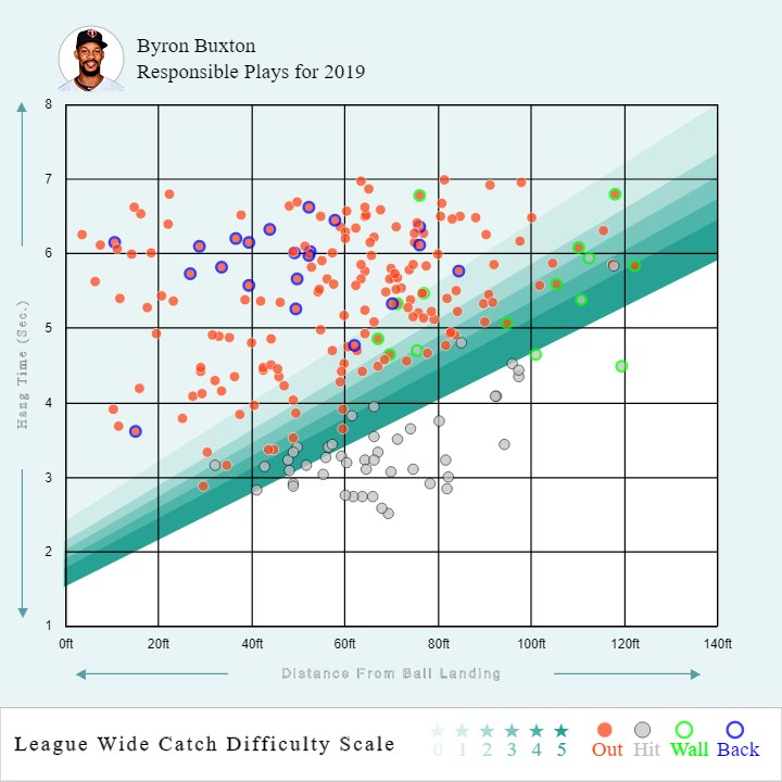 During the 2017 campaign, Buxton was awarded the Platinum Glove for being the AL’s best defender. In that season, he had a career-high 26 outs above average. So far this season, he has 12 outs above average, which is still very good and could have him on pace to have close to 20. His responsible plays chart (see below) should be submitted to the Smithsonian as he has multiple catches this season with a 0% catch probability.