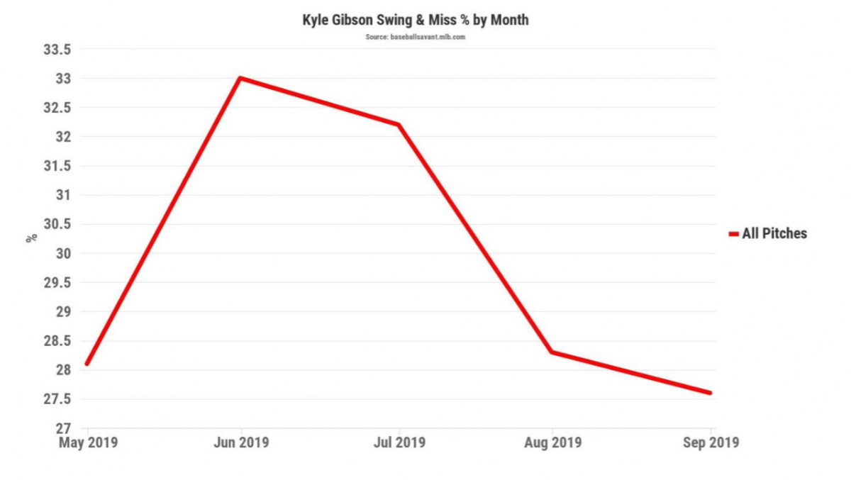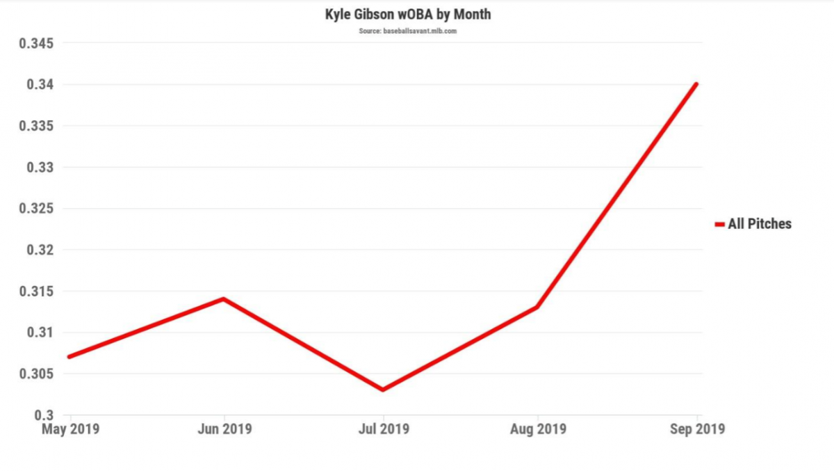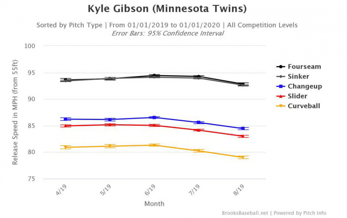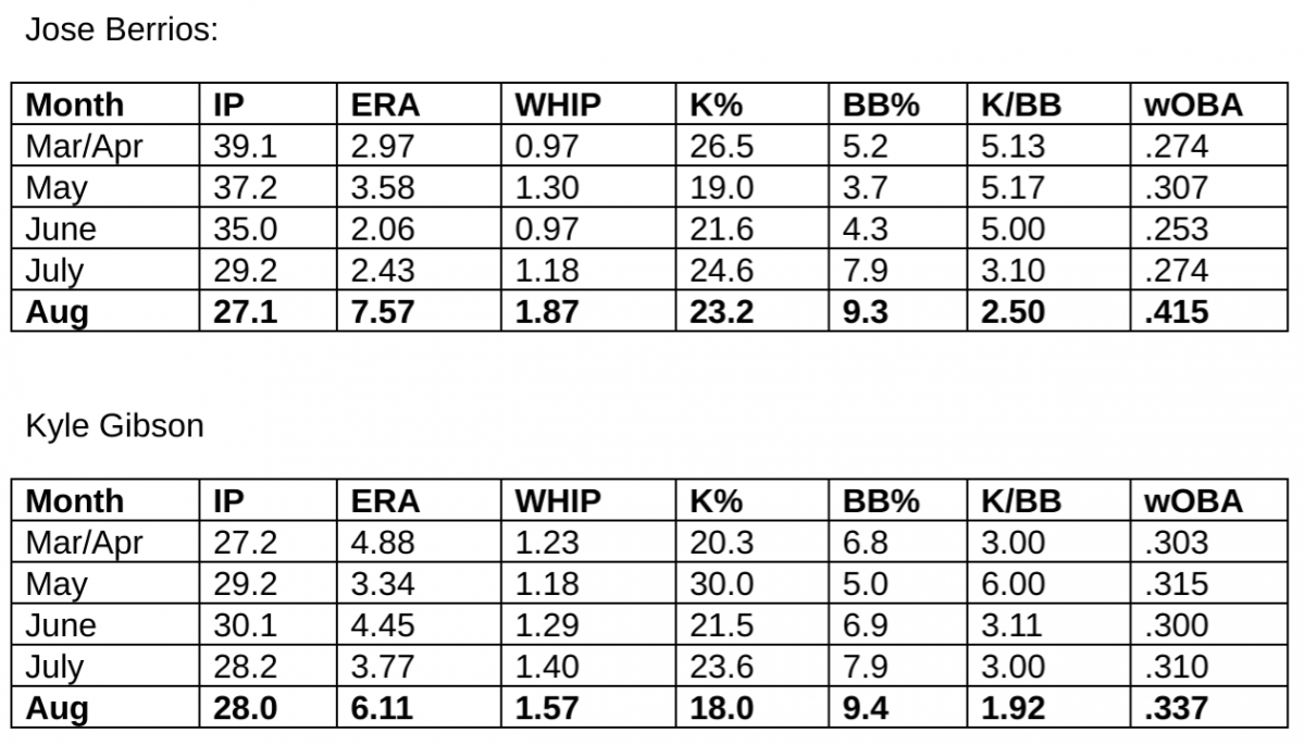 While it is normal for pitchers to wear down as the season winds on, both Berrios and Gibson have seen significant decreases in their fastball velocities of late. Berrios’ average four-seam fastball is down to 92.74 mph in August (high of 94.14 mph in April) with his two-seamer down to 91.47 mph (high of 93.4 in June). Gibson is in the same boat as his four-seamer is down to 92.81 mph (high of 94.43 in June) and his two-seamer came in at 92.61 mph (high of 94.11 in June). Since both Gibson and Berrios have good but not elite velocity, losing a tick or two on their fastballs can be quite a detriment to success.