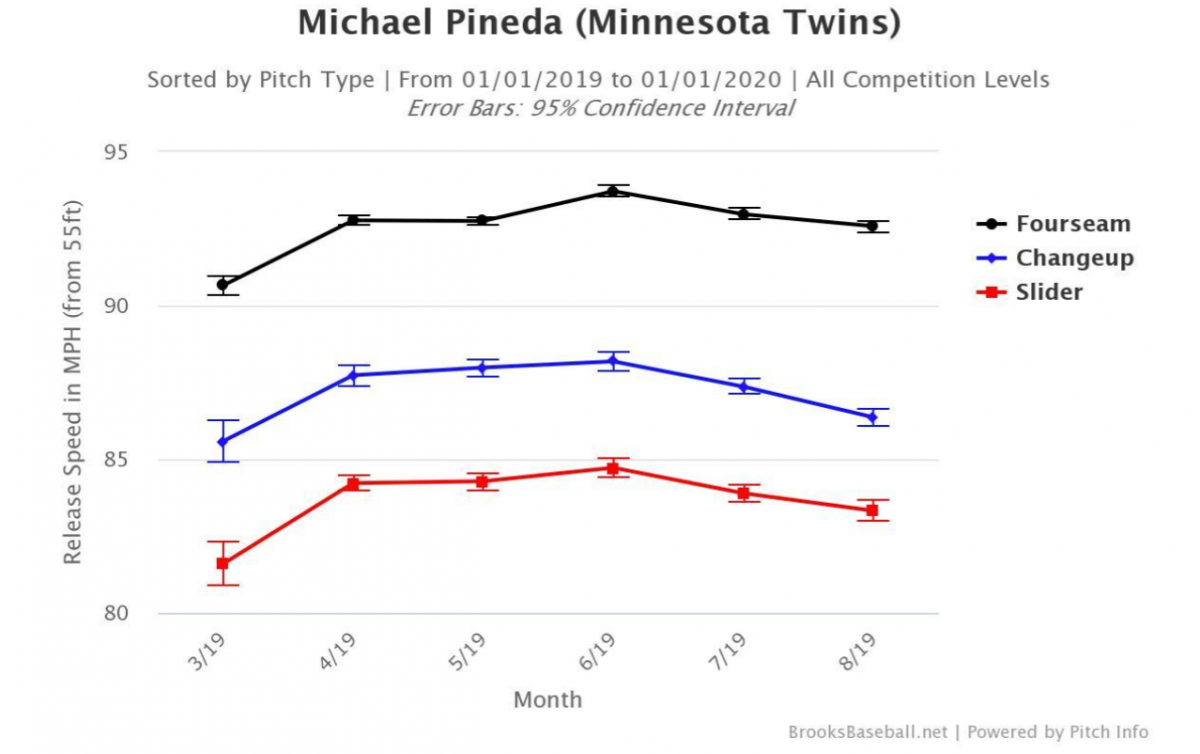Unlike with Gibson and Berrios, the Twins have been more careful and deliberate in getting Pineda rest this season. Pineda has twice hit the 10-day IL with somewhat dubious injuries allowing the Twins to limit his innings. Of course, Pineda did not pitch in 2018 because of Tommy John surgery and has an extensive injury history, so the Twins were inclined to limit his innings this year and it has seemed to work well for Pineda. His numbers have improved in the second half as his ERA has gone from 4.56 in the first half to 3.27 in the second and he has maintained his fastball velocity through the year.