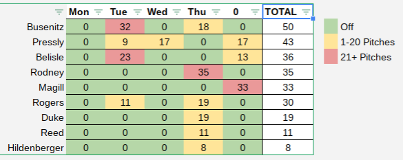 Here’s a quick look at the number of pitches thrown by the bullpen over the past five days: