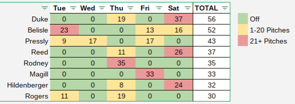 Here’s a quick look at the number of pitches thrown by the bullpen over the past five days:
