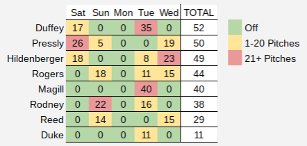 Here’s a quick look at the number of pitches thrown by the bullpen over the past five days: