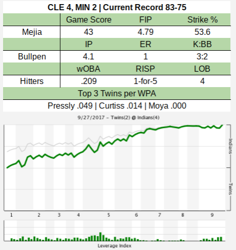 A bright spot for the Twins tonight was the bullpen, as five relievers combined to limit Cleveland to one earned run over 4.1 innings. Another unearned run scored due to an error by Eduardo Escobar. John Curtiss pitched 1.2 no-hit innings in relief and had one strikeout and hit a batter. That’s three-straight scoreless appearances
