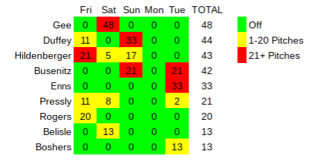 Here’s a quick look at the number of pitches thrown by the bullpen over the past five days: