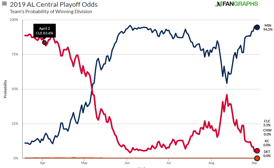 On the morning of Sept. 3, 2019 the Minnesota Twins have a 99.7% chance to make the playoffs and 94.5% chance of winning the division. Of course the division race is not mathematically over, but with just under a month to go and a 6.5 game lead, you have to feel good about where the Twins are. Just look at this fun graph from Fangraphs. The Twins have not been under 50% since May 7 and even when Cleveland took the lead the Twins still had a better chance.