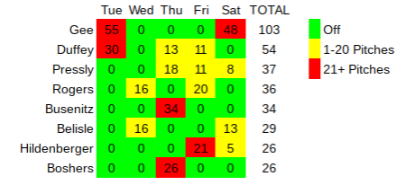 Here’s a quick look at the number of pitches thrown by the bullpen over the past five days: