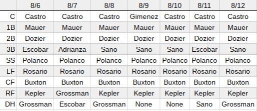 As impressive as it’s been to watch Polanco, Dozier and now Mauer break out over the past couple weeks, Rosario deserves a ton of credit for being such a consistent contributor. After getting off to a bit of a slow start, Rosie had at least an .800 OPS in May, June and July. That mark is up over 1.000 so far in August.