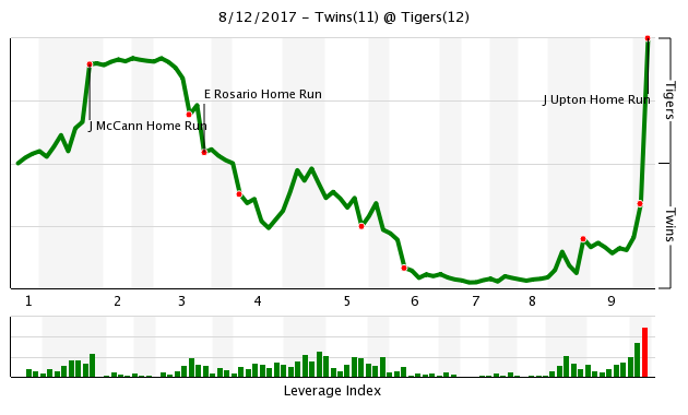 The Twins managed to load the bases in the top of the ninth, but Miguel Sano struck out swinging for the third out. You could feel the momentum shift at Comerica Park.