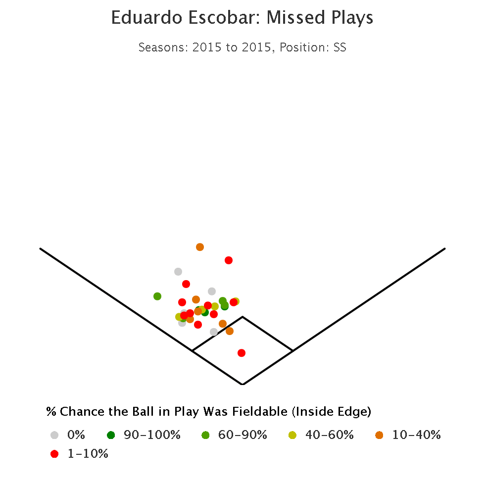 How about the outs Santana didn’t make? Since Fangraphs.com began tracking the revised zone metric (RZR) defensive rating in 2003, Santana’s .758 RZR was the worst among all Twins’ shortstops. What that means is that Santana has converted only 75.8% of plays in his zone into outs. The Twins eventually replaced him with Eduardo Escobar and Fangraphs/Inside Edge’s fielding data shows a remarkable difference for where Santana was significantly worse than Escobar at making simple routine plays: