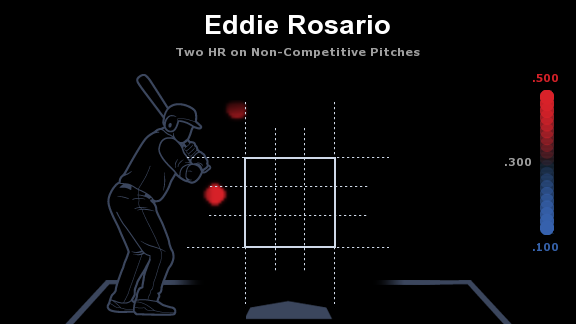 Speaking of out-of-zone home runs...rookie Eddie Rosario’s free-swinging tendencies landed him with some unexpected home runs this year. He was able to launch two shots on pitches not only out-of-zone pitches but those classified as “non-competitive” (basically those pitches categorized as no one in their right mind would swing at). Of course, the outfielder also struck out 45 times on non-competitive pitches, the 8th-most in MLB.