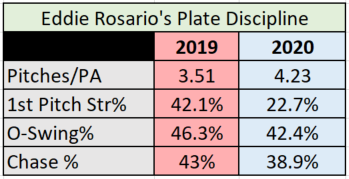 Up to this point in his career, Eddie Rosario has taken a lot of flack for being a free-swinger who bails out pitchers by swinging at pitches out of the zone. He would frequently find himself in pitcher’s counts, and consistently kill rallies by popping up the first pitch of an at-bat after the players in front of him would grind out long ones. In 2019, Eddie Rosario finished last on the Minnesota Twins after he saw just 3.51 pitches per plate appearance. By comparison, more patient hitters like Mitch Garver and Nelson Cruz saw 4.17 and 4.11 pitches per plate appearance respectively. Additionally in 2019, Rosario led the Twins in 1st pitch swing % (42.1%) as well as O-Swing% (46.3% of swings at pitches outside of the strike zone).