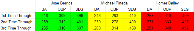 Some pitchers handle the second and third time through better than others. Below you’ll see how Berrios, Pineda, and Bailey have fared throughout their careers: