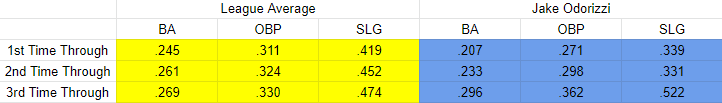 Advances in analytics have made the notion of “third time through” pretty common knowledge in baseball. It only makes sense that the more at-bats hitters gets against a laboring pitcher in a game, the better chance they have at success. Check out the league-wide slash lines allowed by starting pitchers for every time through the order in comparison to Jake Odorizzi for 2019 though.