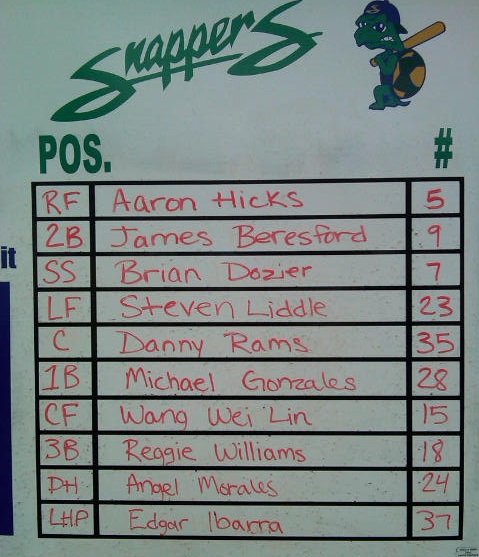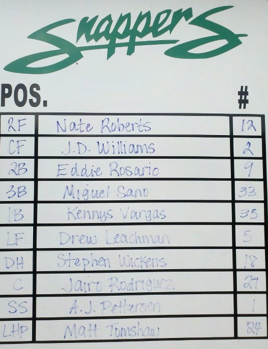 In 2012, I made the trip to Beloit twice. A slender third baseman was kind of the star cleanup hitter for the Snappers. The Beloit lineup in the 2nd half included Eddie Rosario batting third, Miguel Sano batting fourth, and Kennys Vargas batting fifth.