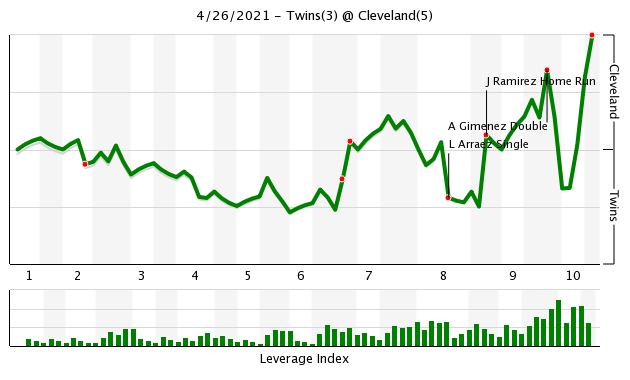After jumping out to a 2-0 lead the Twins were greeted to Cleveland by their former teammate Eddie Rosario. Berrios was able to work around a single by Rosario in the second inning, but the next time around Rosario got the better of his friend. Eddie dropped a double over Arraez's head in left field to score a run and then came around to tie it up on a Reyes single.
