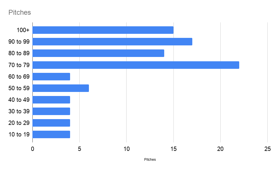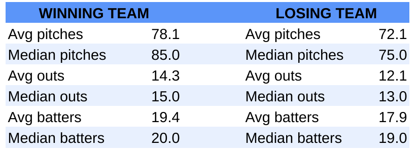 Something odd to note is teams that had a starting pitcher eclipse 100 pitches had a losing record over these rounds, going 7-8. If we look at all games in which a starter threw 90 or more pitches, those teams went 17-15.