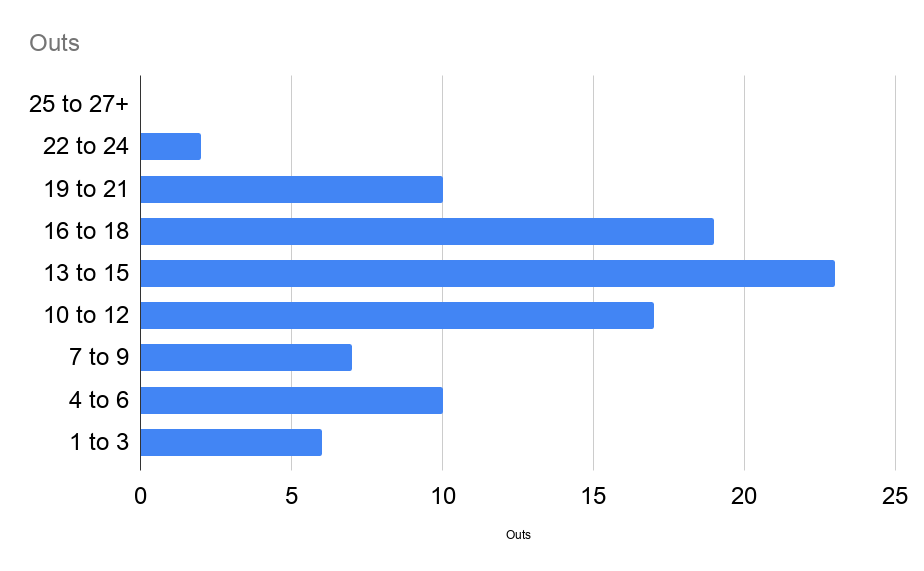 Bullpens are doing a lot of heavy lifting, this is becoming especially true in the postseason. The chart below shows the number of starts by outs recorded in these rounds.