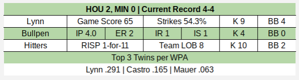 Lynn walked four batters, but two of the three hits he gave up never left the infield and probably would’ve been outs more often than not. Eduardo Escobar had trouble picking up a slow roller at shortstop and Miguel Sano charged in to field a ball but failed to pluck it out of his glove.