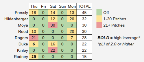 Here’s a quick look at the number of pitches thrown by the bullpen over the past five days: