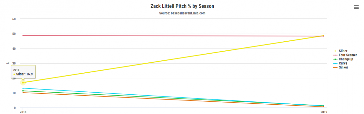 Something concerning I found while looking at Littell’s number was that everything is pointing to a lot of regression. He was able to avoid it last season, but the secondary numbers are worrisome. For example, his ERA was an excellent 2.68 but his FIP was almost a full run higher at 3.62 and then his xFIP was another half run above that at 4.10. This also wasn’t the only number pointing to regression. From Statcast, his barrel% (9.5%), hard hit% (47.6%), and exit velocity allowed (90.7 MPH) were all significantly above league average but for some reason batters just weren’t getting their hits to fall.