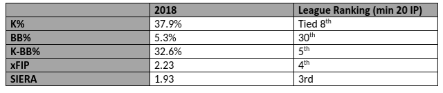 May offers a four-pitch mix which includes a four-seam fastball (94mph), curve (78mph), slider (87mph), and changeup (86mph). May’s fastball is relatively flat, with slightly above average velocity. He has good downward movement on his curveball and a changeup which generates a large number of ground balls. All this is fairly typical and would not lead one to the conclusion that May would produce the kind of results he did in 2018 (albeit with a limited sample size). This begs the question - how is May getting such outstanding results without truly mind-blowing reliever stuff?