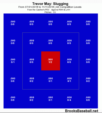 By contrast, a similar heat map of opposing SLG% against May’s curveball shows his ability to cluster location more tightly and the impact resulting from impressive command of a pitch.
