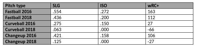 The chart above shows May’s vertical release points for his primary pitches between 2016 and 2018. There is a noticeable drop in his release point on all three of his primary pitches. May’s release point drop has had a fascinating impact on all three of his primary pitches in 2018.
