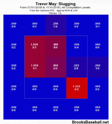 Looking at May’s heat map of SLG% against his fastball highlights the challenge. He leaves a number of fastballs up and in to LHH and down and in to RHH. May had excellent control in 2018 (1.78 BB/9) but needs to establish better fastball command, as a lack of movement makes it a hittable pitch.