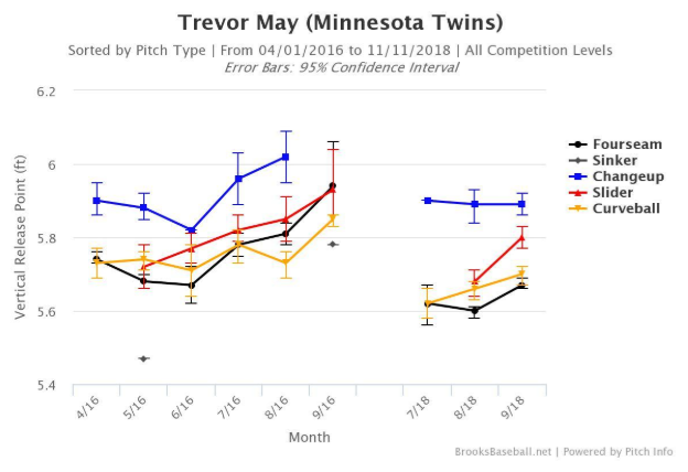 May has shown impressive improvement throughout his pitch arsenal, including his fastball, but the primary reason for his breakout in 2018 was developing a high quality breaking and off-speed pitch, both of which have been outrageously effective, albeit in a limited sample. May is an unusual MLB success story, starting to put his considerable talent together in his age 29 season. Examining the tweaks that led to his improved secondary arsenal is key in determining what the Twins might expect from May in 2019.