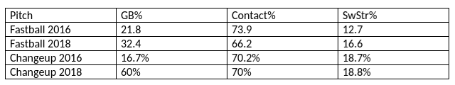 May has seen an increase in his GB% on his fastball, leading to less contact and a higher swinging strike percentage. The impact on his changeup was dramatic, with an increase in GB% of almost 45%. May’s changeup is not a newly dominant strikeout pitch, it just consistently generates weak groundball contact.
