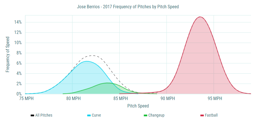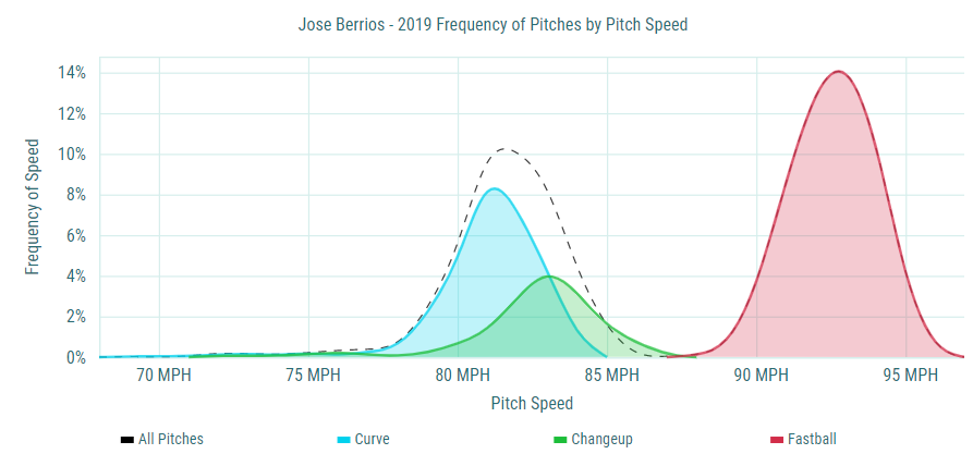 Back in 2017, his first full MLB season, Berrios was hitting 95 mph with his fastball over 10% of the time. Flash forward to 2019 and that percentage has dropped to less than 4% of the time.