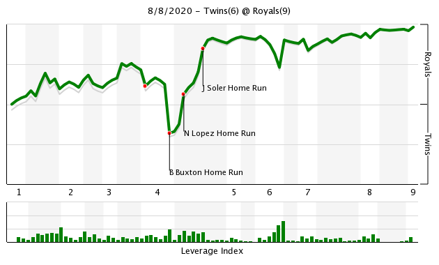 Lewis Thorpe entered with a 4-2 lead and lasted only the three batter minimum. Cody Stashak was called next and made multiple mistakes. Jorge Soler and Salvador Pérez made him pay with booming, back-to-back home runs. Soler homered twice in the first four innings.