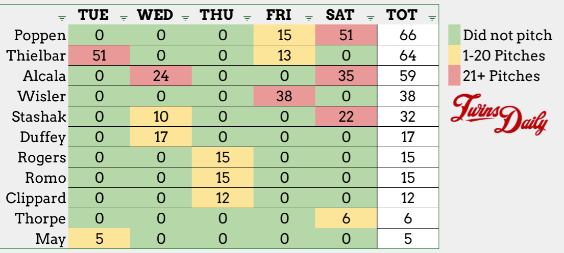 The Twins have yet to use Sergio Romo, Trevor May, Tyler Duffey or Taylor Rogers this weekend. The bullets are in the bullpen gun for Sunday and for next week’s series in Milwaukee.