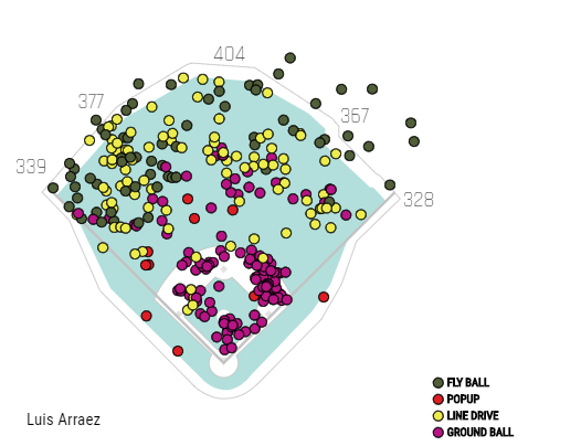 The center fielder’s job is harder. Arráez puts pressure on them by hitting to both gaps, and by occasionally lofting a ball to dead center field that requires them to go back to the wall. So many more of his batting balls are lower-trajectory hits to the middle of the diamond, though, that center fielders should still play quite shallowly against him. Given his lack of top-end speed, a good center fielder should be able to hold him to a double even if he gets the ball over his head, and those types of hits off Arráez’s bat are much less common than ones that drop in front of a center fielder in standard position.