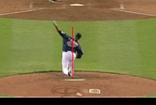 The image below is from his April 12, 2012 start against the Angels. Notice now that instead of being directly over that front leg, his weight – particularly his front hip – is pulling towards his glove side at his release point: