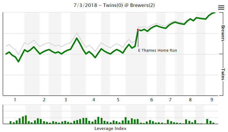 The lone runs in the game came on a two-run home run from Brewers outfielder Eric Thames in the bottom of the fifth.