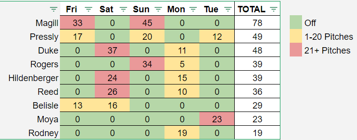 Here’s a quick look at the number of pitches thrown by the bullpen over the past five days:
