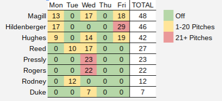 Here’s a quick look at the number of pitches thrown by the bullpen over the past five days: