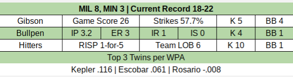 Kyle Gibson had a rough start, giving up five runs over 5 1/3 innings, and the bullpen also struggled (three more runs over 3 2/3 innings). But, as has been the case often so far this season, Max Kepler and Eduardo Escobar were pluses.