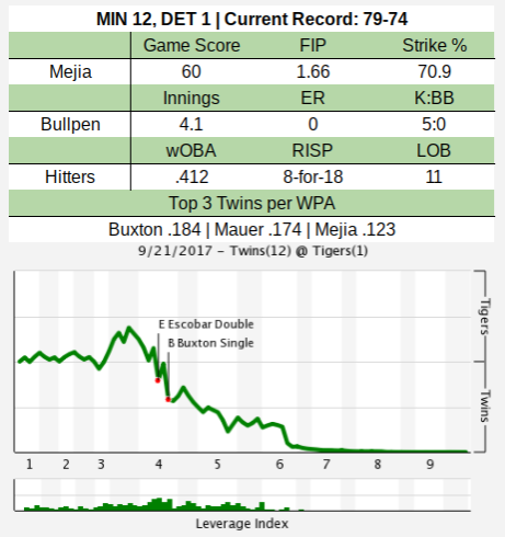 Adalberto Mejia didn’t last very long, but the results were encouraging while he was out there. In just his second start since returning from the DL, Mejia held Detroit to one run on four hits and a walk over 4.2 innings. He had five strikeouts.