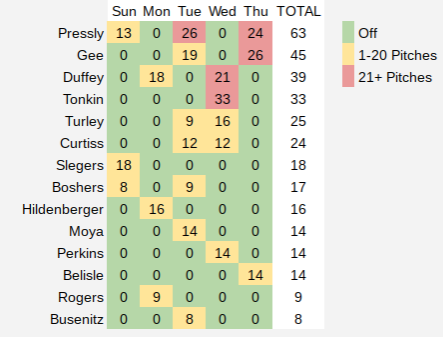 Here’s a quick look at the number of pitches thrown by the bullpen over the past five days: