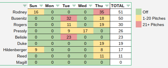 Here’s a quick look at the number of pitches thrown by the bullpen over the past five days: