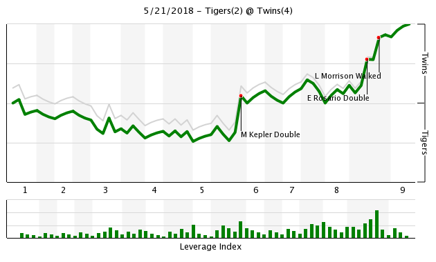 This one was tied at 2-2 heading into the bottom of the eighth inning and at that point Eddie Rosario basically decided the Twins were going to win this ballgame. After Eduardo Escobar drew a one-out walk, Rosie hit a pitch that was about eyeball high for a double. The Tigers intentionally walked the next batter to load the bases and then unintentionally walked Logan Morrison on four pitches to give the Twins the lead.