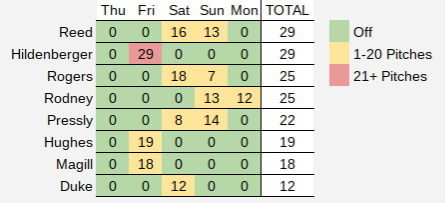 Here’s a quick look at the number of pitches thrown by the bullpen over the past five days: