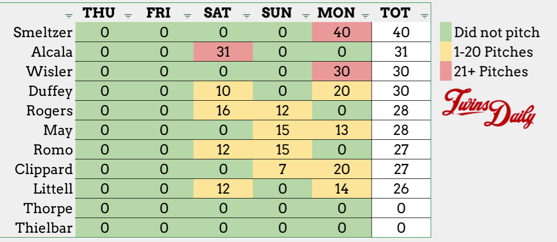 From there, Tyler Clippard recorded four outs before Tyler Duffey and Trevor May each turned in a scoreless frame. Zack Littell gave up a solo homer in the ninth. All told, the Twins combined to give up seven hits and two walks while striking out nine batters.